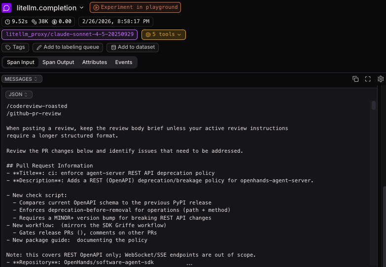 The first step to monitoring is logging, and OpenHands is instrumented with OpenTelemetry compatible hooks, provided by the open-source Laminar library. So if you want to save the agent's behavior while it executes the skill, you can choose your favorite OpenTelemetry-compatible monitoring solution, and save the files.