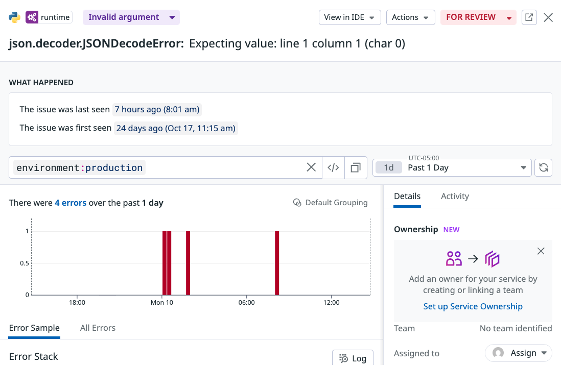 One feature that we particularly like is Datadog's Error Tracking, which groups similar errors together and provides detailed insights into their occurrences, stack traces, and affected services.