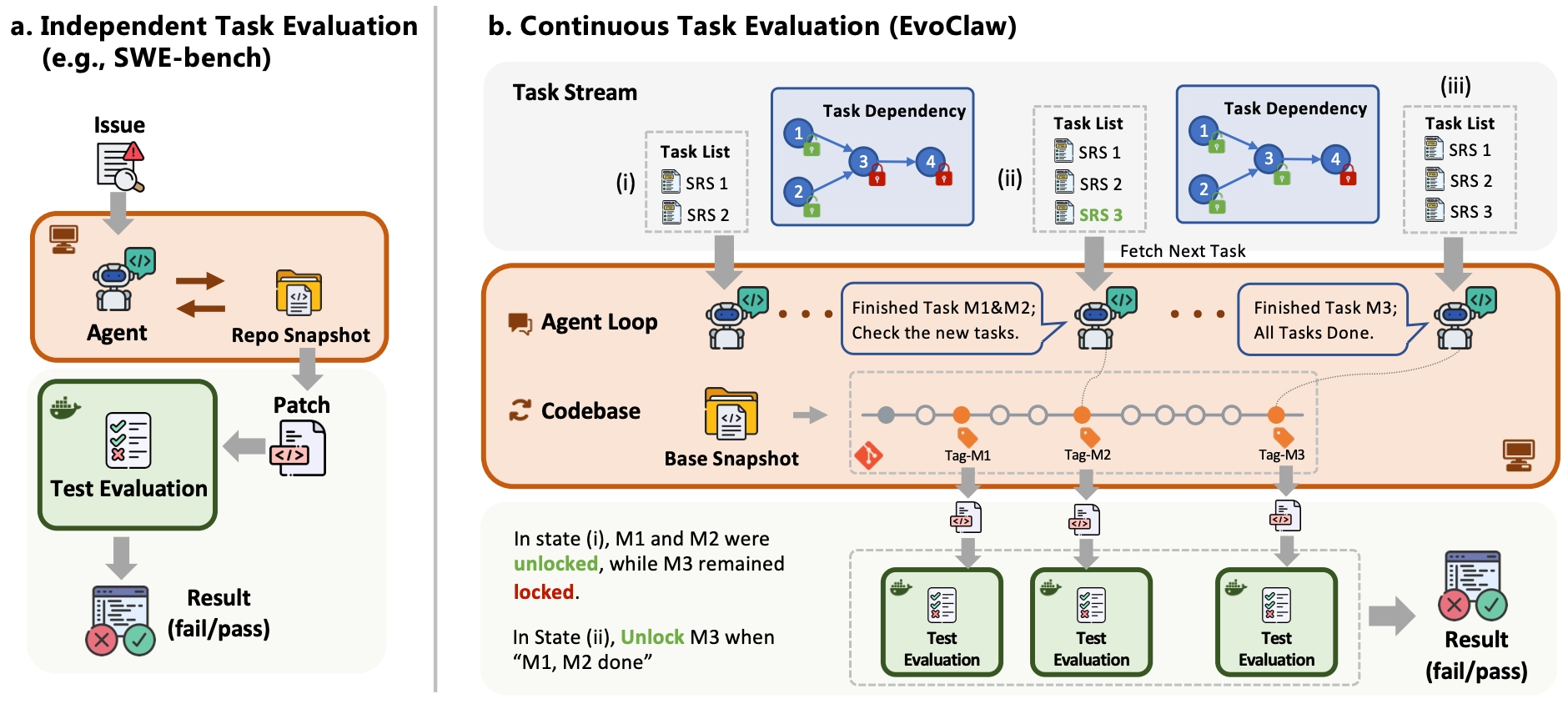 That is what EvoClaw is designed to measure. It evaluates agents on continuous software evolution by asking them to complete a sequence of dependent milestone tasks extracted from real repository history.