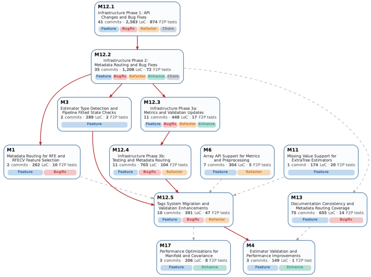 A single commit is often too small and too noisy to serve as a meaningful development objective. At the other extreme, release-level changes are too coarse and hide the dependency structure that makes long-horizon maintenance difficult. EvoClaw works at the milestone level: semantically and functionally coherent units that are still executable and testable.