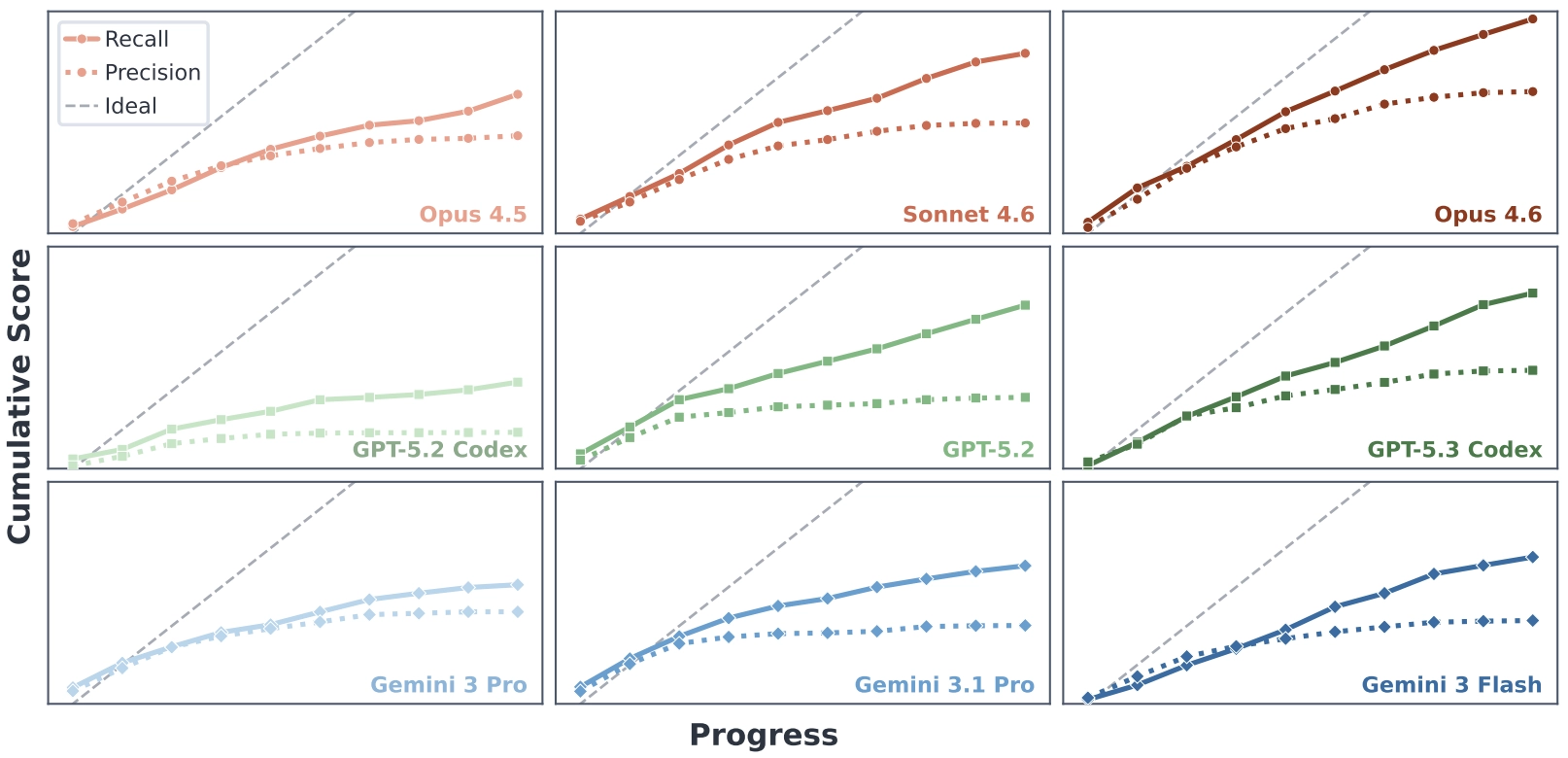 Recall keeps rising almost linearly. Even as the codebase becomes messier and more fragile, agents remain fairly good at implementing new requested functionality. The bottleneck is precision: models struggle to preserve existing behavior, and regressions accumulate faster than they can be repaired.